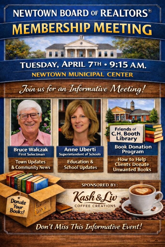 Join us for an engaging Newtown Board of Realtors membership meeting featuring timely insights from First Selectman Bruce Walczak and Superintendent of Newtown Public Schools Anne Uberti. We’ll also hear briefly from a representative of the Friends of the C.H. Booth Library, who will share how they can help your clients responsibly donate unwanted books. Plus, enjoy fresh coffee and treats courtesy of our sponsor, Kash & Liv Coffee Creations! A great opportunity to stay informed, connected, and caffeinated. ☕